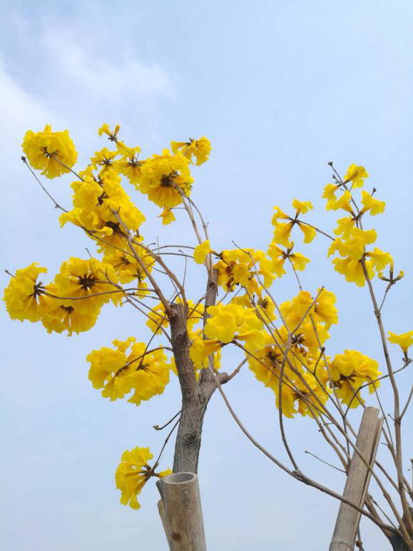 3月18日早上7點多就起來,天氣晴好風(fēng)和日麗。按計劃9:00準(zhǔn)時到達(dá)第一站指定集合處,接近沙澳收費站的沿途高速路一側(cè),在早晨陽光的映襯下,滿眼絢麗的金黃色,樹枝不見一片綠葉!“忽如一夜春風(fēng)來,千樹萬樹“黃花開”,滿樹金色的風(fēng)鈴花就像搖錢樹似的,金燦燦的黃花為惠州的道路景觀增添了一抹亮麗的春色。