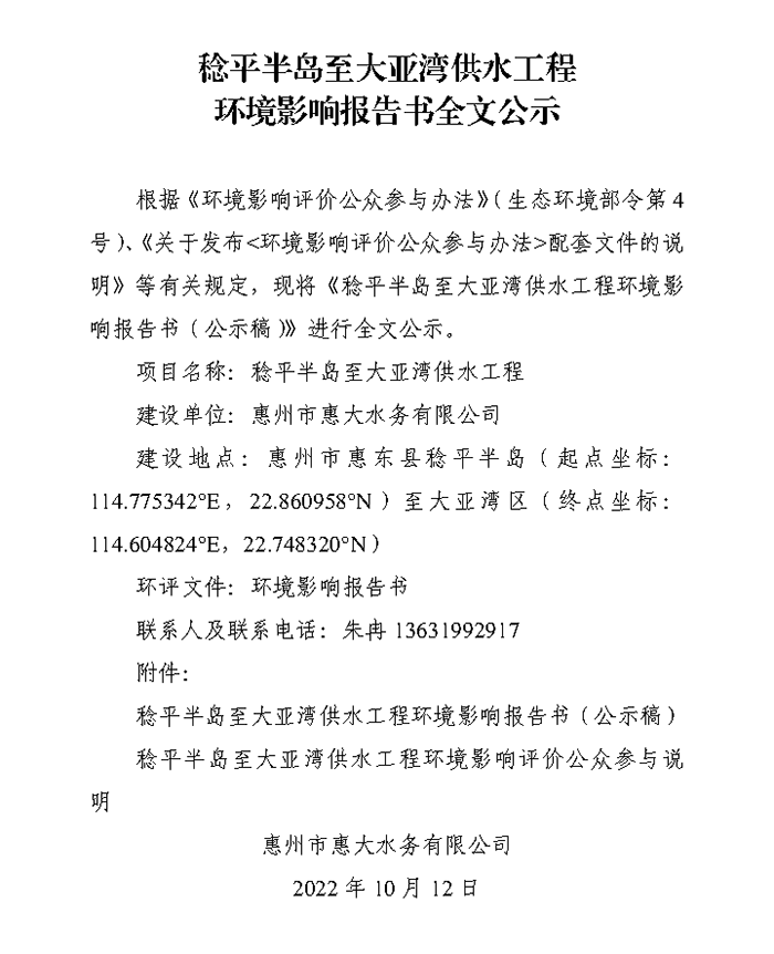 稔平半島至大亞灣供水工程 環(huán)境影響報告書全文公示